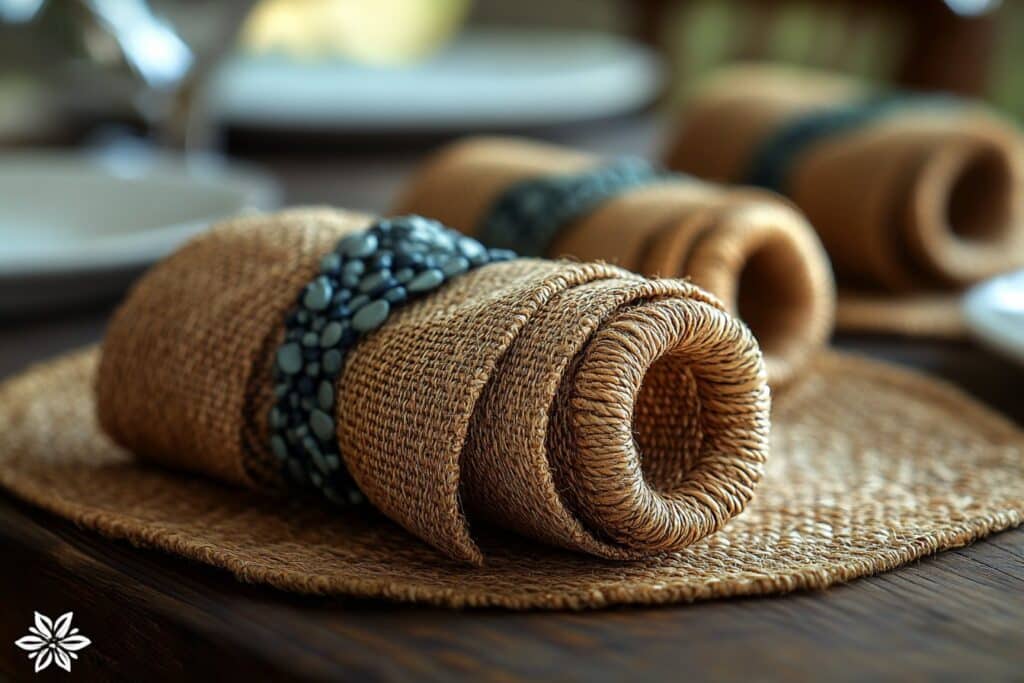 Un autre conseil consiste à jouer avec différentes largeurs et textures de tissus pour vos ronds de serviette. Par exemple, combiner la toile de jute avec du lin ou du coton peut donner un superbe mélange visuel et tactile.