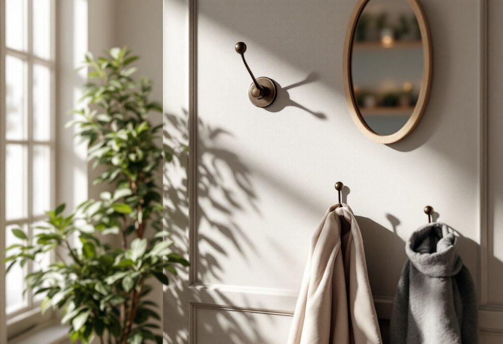 Pensez également aux accessoires complémentaires, tels qu’un miroir élégant au-dessus des patères. Non seulement le miroir est fonctionnel, mais il contribue aussi à agrandir visuellement l’espace en réfléchissant la lumière. Vous pouvez également l’entourer d’un cadre assorti aux patères pour une cohésion visuelle.