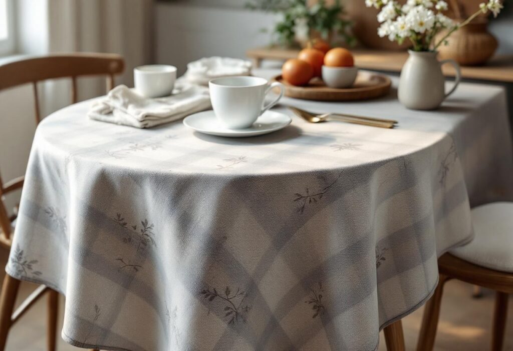 L’utilisation d’une nappe rectangulaire sur une table ronde reste fréquente, surtout lorsque l’on cherche une alternative économique ou que l’on souhaite profiter d’un motif précis. Beaucoup optent pour cette astuce : replier les angles sous le plateau afin d’atténuer l’excédent de tissu.